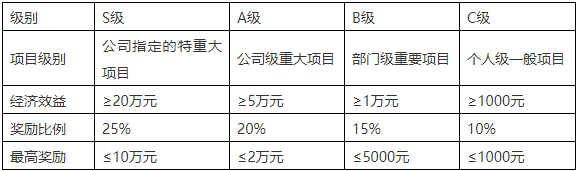 公司推行項(xiàng)目改善從質(zhì)量、成本、生產(chǎn)、交付、安全、設(shè)備改進(jìn)、團(tuán)隊(duì)及技術(shù)改善類等方面推進(jìn),不斷完善制度流程化建設(shè),同時(shí)建立獎勵機(jī)制,按改善項(xiàng)目重要等級分S級、A級、B級、C級,按級別比例進(jìn)行最高獎勵。