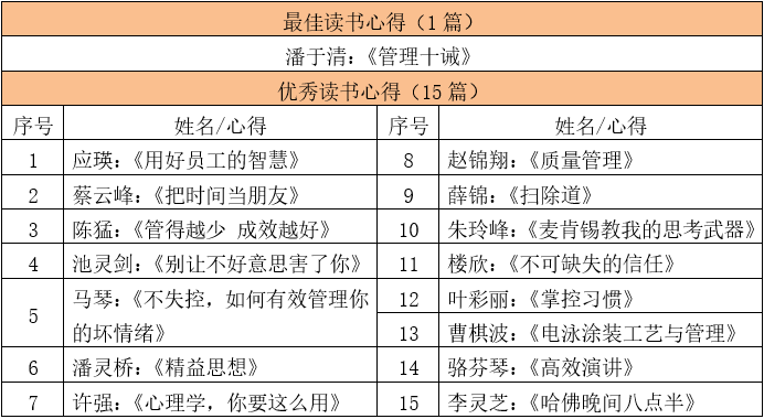 本次為2019年第三季度讀書心得評選活動,經(jīng)總裁辦校對、審核,從100多篇心得中初選出30篇,再根據(jù)主題明確、立意新穎、結(jié)合工作實際、文字通順完整等篩選出16篇優(yōu)秀心得,其中獲得本季度“最佳讀書心得”得主品質(zhì)部潘于清的《管理十誡》評選。最佳及優(yōu)秀文稿如下: