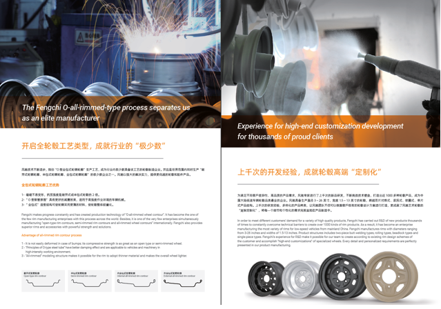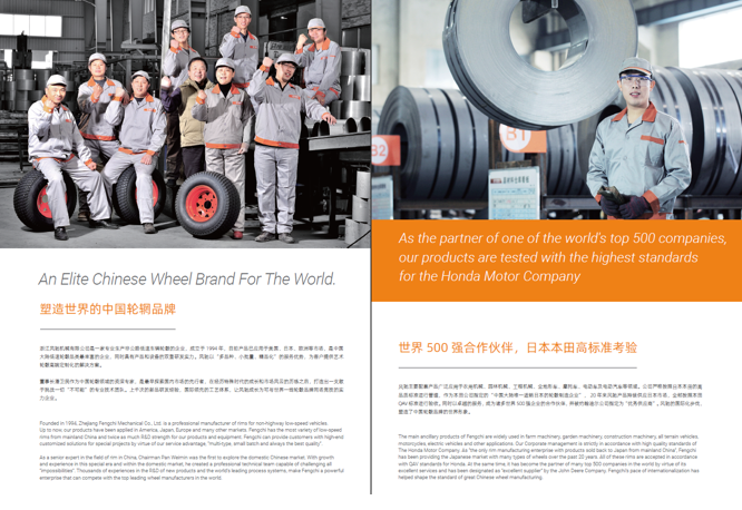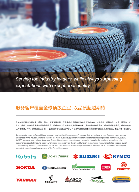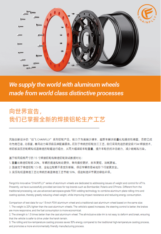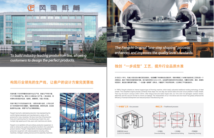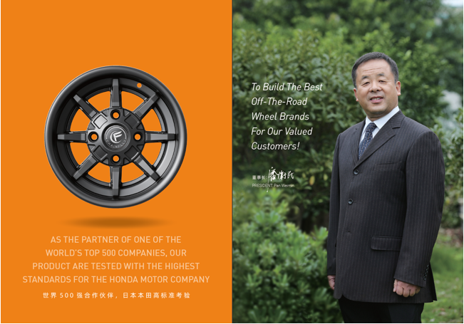 浙江風(fēng)馳機械有限公司,成立于1994年,伴隨著時間的飛逝,一直以工匠精神專注生產(chǎn)非公路低速車輛輪轂,在董事長潘衛(wèi)民的英明帶領(lǐng)下,風(fēng)馳以自信、沉穩(wěn)、堅實的腳步,企業(yè)逐步成為了世界500強合作伙伴、申請了企業(yè)獨有的輪輞品牌、創(chuàng)立了旗下5家子公司、獨創(chuàng)特殊工藝、產(chǎn)品革新?lián)Q代,一直以實現(xiàn)“引領(lǐng)低速車輪發(fā)展,為中國制造正名”的使命及成為“全球知名低速車輛制造企業(yè)的最佳戰(zhàn)略合作伙伴”為愿景而一直努力著。