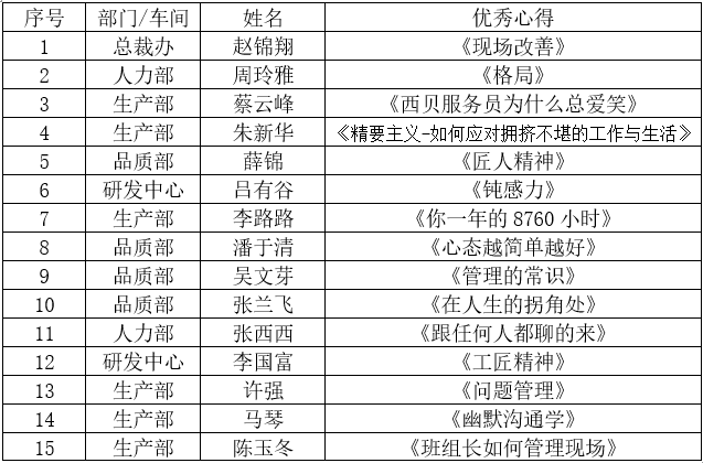 本次為第四季度讀書心得評(píng)選活動(dòng),經(jīng)總裁辦校對(duì)、審核,從100多篇心得中初選出30篇,再根據(jù)主題明確、立意新穎、結(jié)合工作實(shí)際、文字通順完整等篩選出16篇優(yōu)秀心得,其中獲得本季度“最佳讀書心得”得主是生產(chǎn)部潘靈橋《不會(huì)帶團(tuán)隊(duì),你就只能干到死》。其余優(yōu)秀文稿如下: