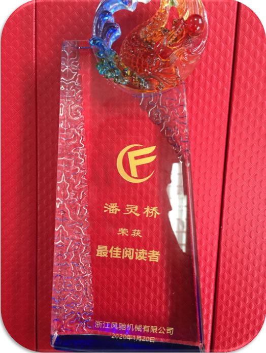 通過對(duì)四個(gè)季度最佳及優(yōu)秀心得匯總,經(jīng)公司領(lǐng)導(dǎo)層最終評(píng)選生產(chǎn)部潘靈橋?yàn)?019年度“最佳閱讀者”,并授予該榮譽(yù)獎(jiǎng)杯。