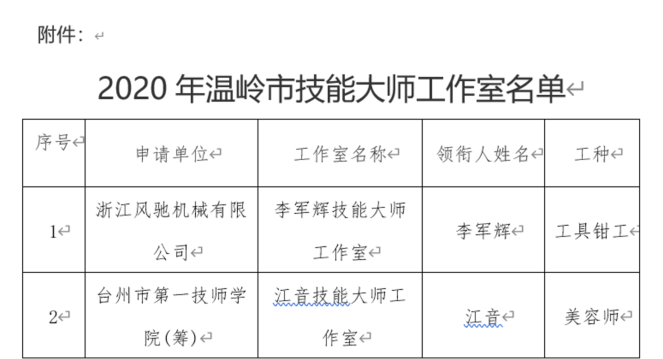 我司根據(jù)《關(guān)于深入實(shí)施2020年度溫嶺市技能大師工作室項(xiàng)目建設(shè)及考核評(píng)估的通知》(溫人社發(fā)〔2020〕59號(hào))文件精神,通過(guò)自行推薦以及地方政府的大力支持,充分準(zhǔn)備了相關(guān)申報(bào)資料,通過(guò)主管部門的初審以及專家的評(píng)審、部門審議和社會(huì)公示等評(píng)選環(huán)節(jié),我司最終順利通過(guò)評(píng)審,被評(píng)定為“李軍輝技能大師工作室”并于政府平臺(tái)公示。