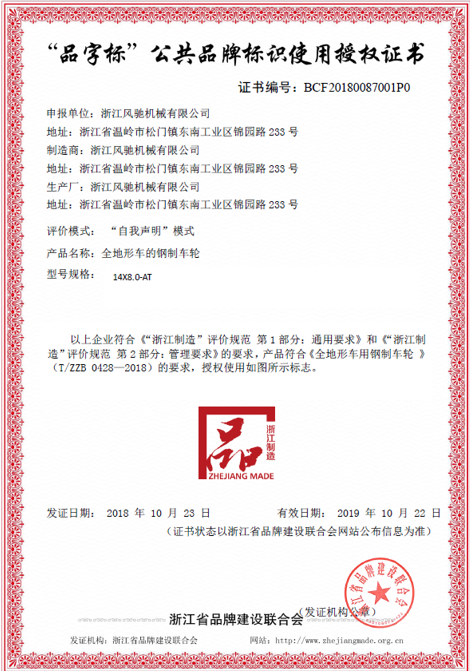 我司是在去年積極響應(yīng)浙江制造品牌建設(shè),在完成上一階段浙江制造團(tuán)體標(biāo)準(zhǔn)《全地形車(chē)用鋼制車(chē)輪》(T/ZZB 0428-2018)的申報(bào)、審批與發(fā)布實(shí)施后,在此基礎(chǔ)之上,于2018年9月份申報(bào)了“品字標(biāo)公共品牌標(biāo)識(shí)”,通過(guò)“自我申明”評(píng)價(jià)模式及資質(zhì)審核,順利通過(guò)評(píng)審,獲得了“品字標(biāo)”公共品牌標(biāo)識(shí)使用證書(shū)。